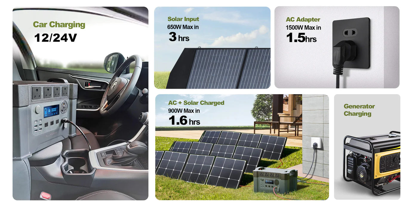 With 1500W AC input (NO HEAVY, BULKY ADAPTOR or BRICK), ALLPOWERS S2000 Pro portable power station can be fully recharged within 1.5 hours. Via MPPT 650W max solar input, solar generator can be fully recharged within 3 hours (increases 20% compared with ordinary solar charging without MPPT controller).