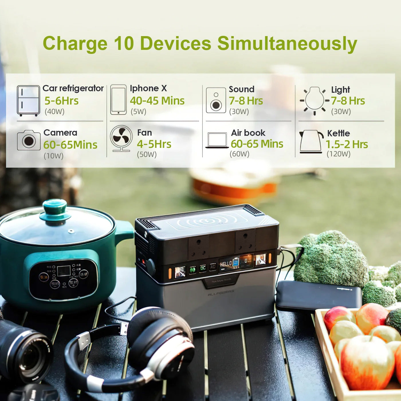 ALLPOWERS portable power station is equipped with a 288 watt-hour battery pack. Portable power source features 2*AC ports (110V/60Hz, 300W, peak 500w), 1*TYPE-C port (5V-20V/ 60W max, QC3.0), 3*USB ports(5V/ 3A), 2*DC ports (12V/ 5A), 1* car socket(12V/10A) and a wireless charger(5V/2.1A) at the top. Allpowers portable power station gives you the ports you need to charge all of your devices at the same time.