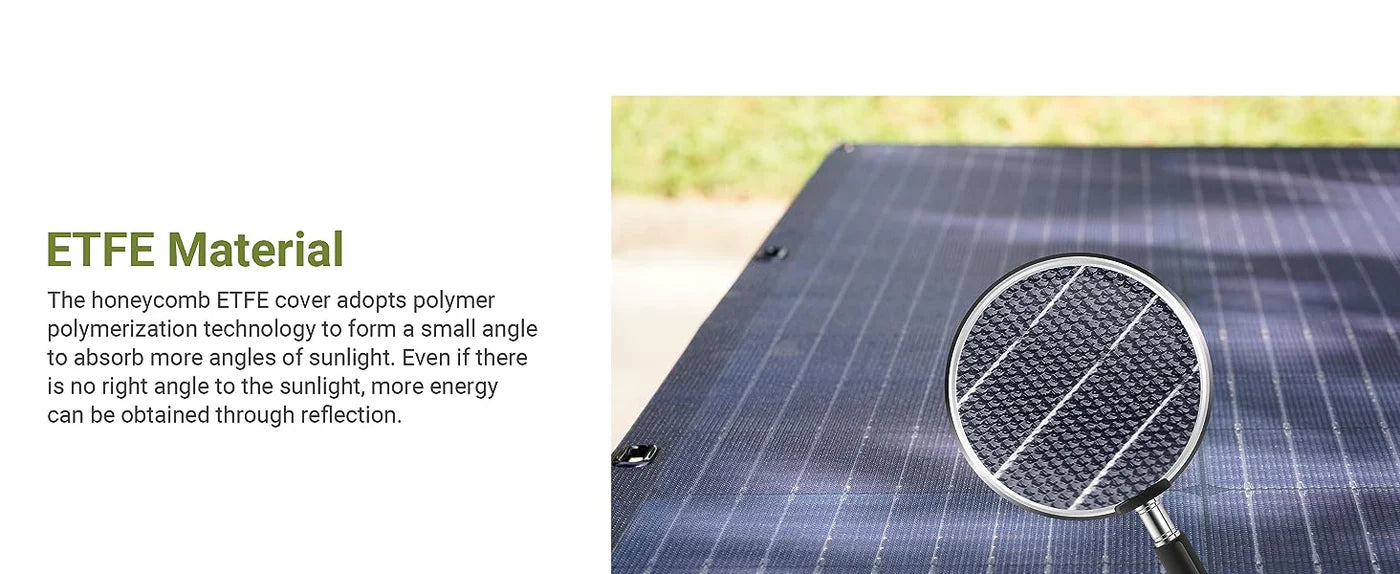 ALLPOWERS SF200 Flexible solar panel are made in Monocrystalline solar cells, whose conversion rate can reach 23%-25%. Honeycomb ETFE is used on the surface, and the unevenness forms refraction to collect sunlight from different angles. Coupled with the Solar connector port with minimal loss, you can get more power at the same time. Great choice for RVs, roofs, campers, trailers, boats, cabins, sheds, tents, yachts.