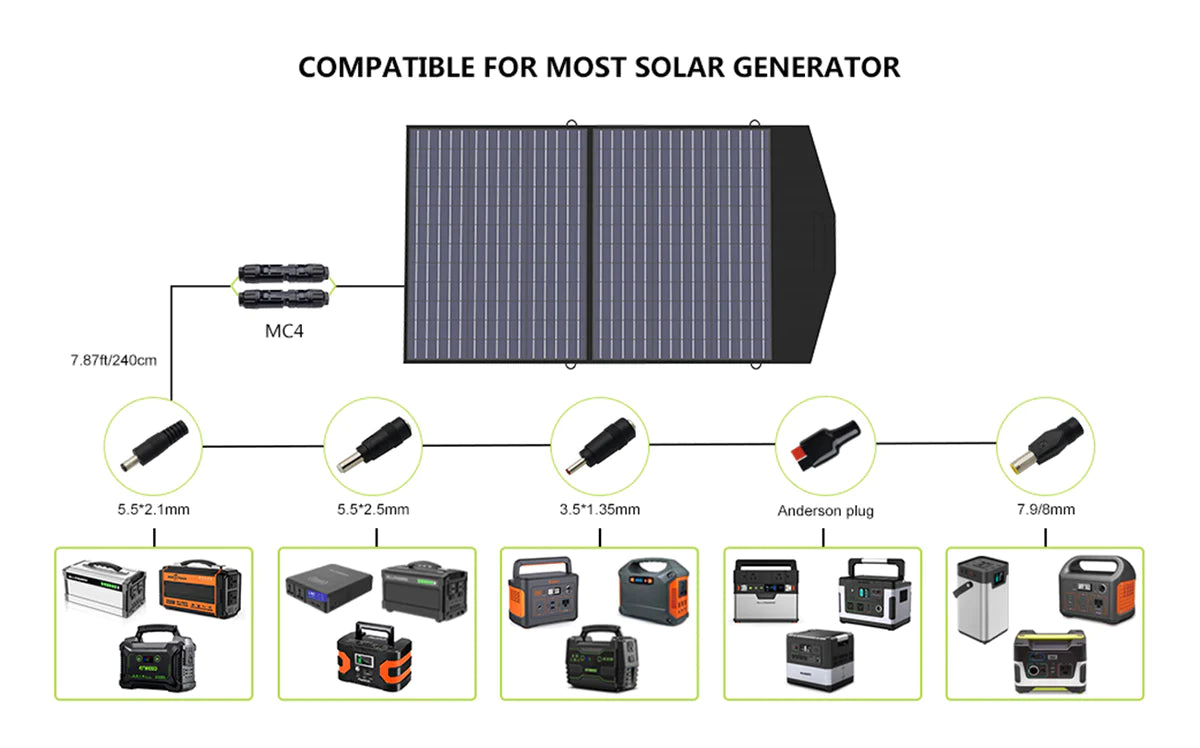 ALLPOWERS 100W foldable solar panel is compatible with most solar generator/portable power station on the market. The portable solar panel kit Includes different sizes of connectors for portable generator( Solar Connectors to Anderson / Solar Connectors to DC )